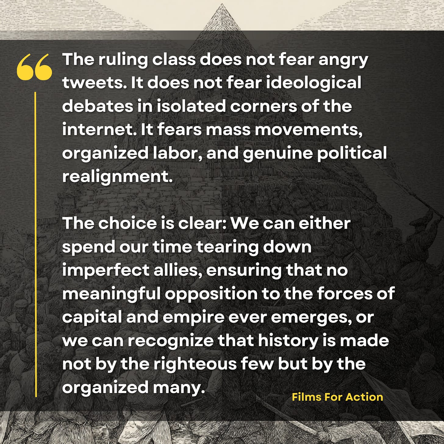 The ruling class does not fear angry tweets. It does not fear ideological debates in isolated corners of the internet. It fears mass movements, organized labor, and genuine political realignment. The only way forward is to recognize the material realities of power, build alliances where possible, and act with the strategic discipline that our opponents so effectively deploy against us.